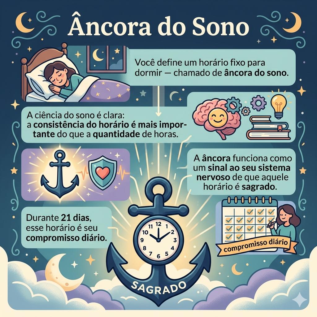 VocΓͺ define um horΓ‘rio fixo para dormir β chamado de Γ’ncora do sono. A ciΓͺncia do sono Γ© clara: a consistΓͺncia do horΓ‘rio Γ© mais importante do que a quantidade de horas. A Γ’ncora funciona como um sinal ao seu sistema nervoso de que aquele horΓ‘rio Γ© sagrado. Durante 21 dias, esse horΓ‘rio Γ© seu compromisso diΓ‘rio.