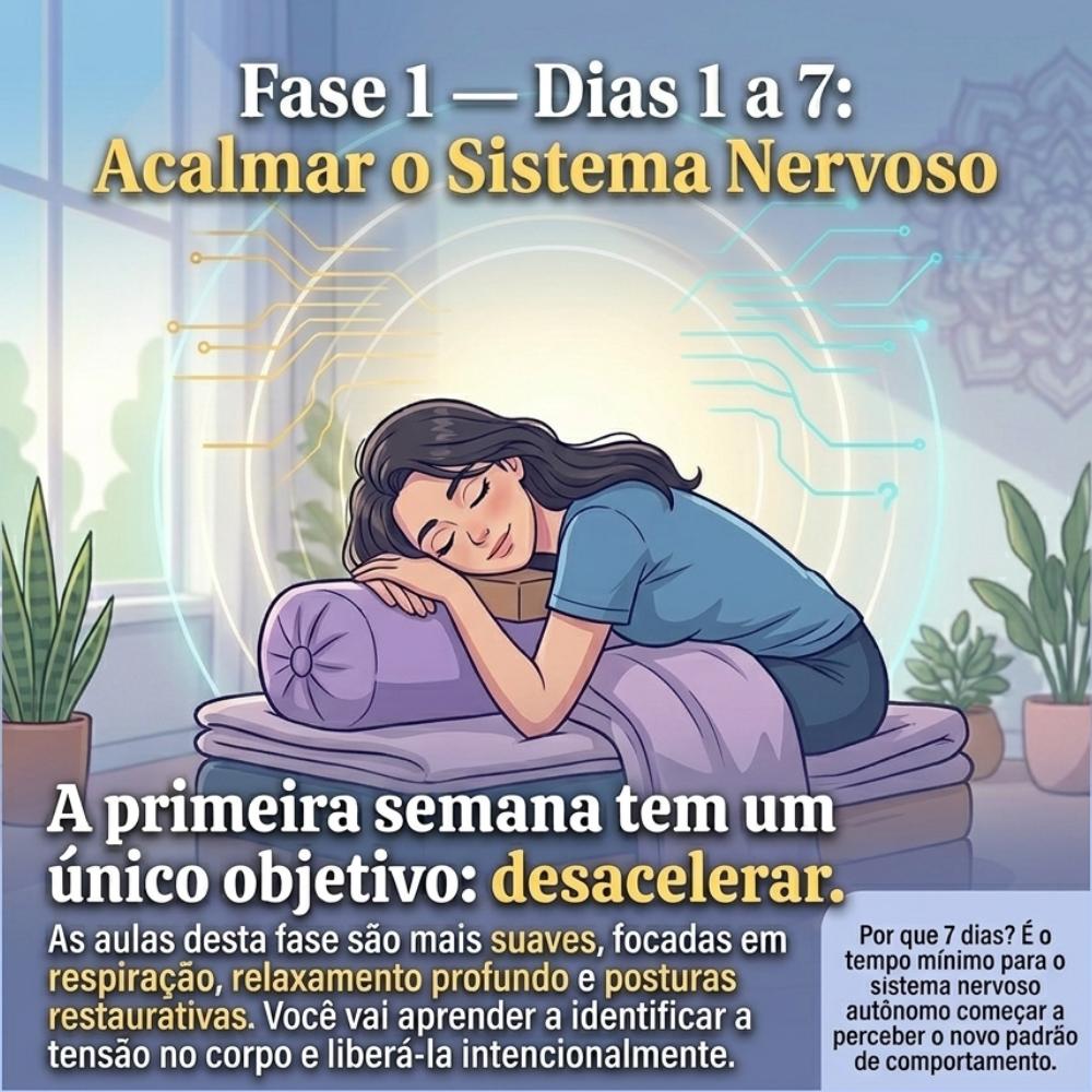 As aulas desta fase sΓ£o mais suaves, focadas em respiraΓ§Γ£o, relaxamento profundo e posturas restaurativas. VocΓͺ vai aprender a identificar a tensΓ£o no corpo e liberΓ‘-la intencionalmente β uma habilidade que serΓ‘ usada pelo resto da vida.