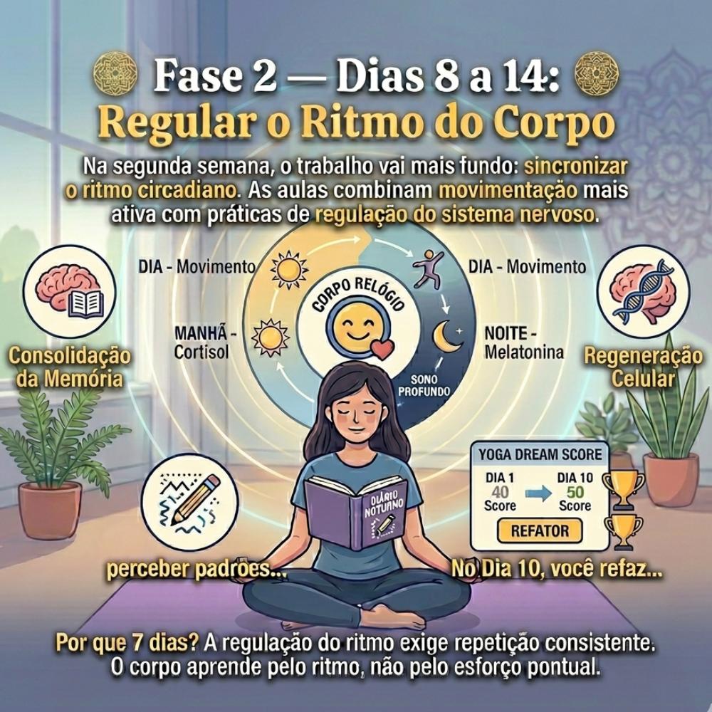 Por que 7 dias nessa fase? Porque a regulaΓ§Γ£o do ritmo circadiano exige repetiΓ§Γ£o consistente. O corpo aprende pelo ritmo, nΓ£o pelo esforΓ§o pontual.