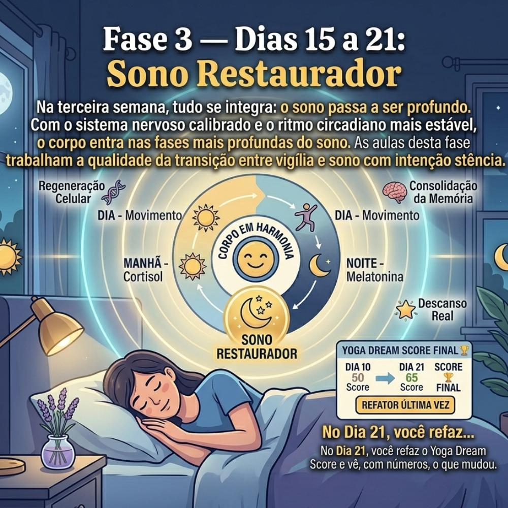 As aulas desta fase combinam movimentaΓ§Γ£o mais ativa com prΓ‘ticas especΓficas de regulaΓ§Γ£o do sistema nervoso. VocΓͺ tambΓ©m comeΓ§a a perceber padrΓ΅es no seu diΓ‘rio noturno β e esses padrΓ΅es revelam o que estΓ‘ interferindo no seu sono.