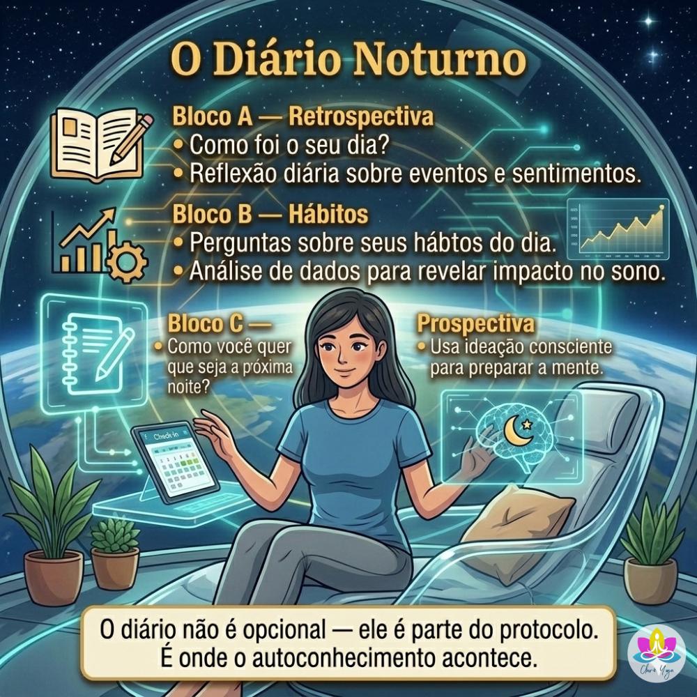 Bloco C β Prospectiva: Como vocΓͺ quer que seja a prΓ³xima noite? Qual Γ© a sua intenΓ§Γ£o para o descanso de hoje? Essa etapa usa o poder da ideaΓ§Γ£o consciente para preparar a mente para o sono.